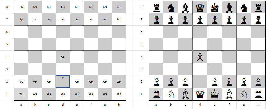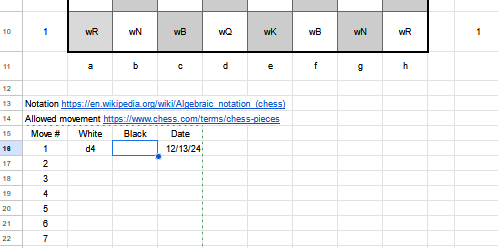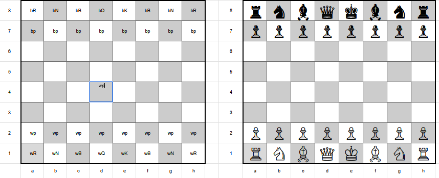 - Move pieces by entering their code in the destination cell and then deleting their code from the source cell. DON’T USE COPY/PASTE. That will mess up the formatting. For example to move the white pawn in d2 to d4 (i.e. “d4” in algebraic notation)